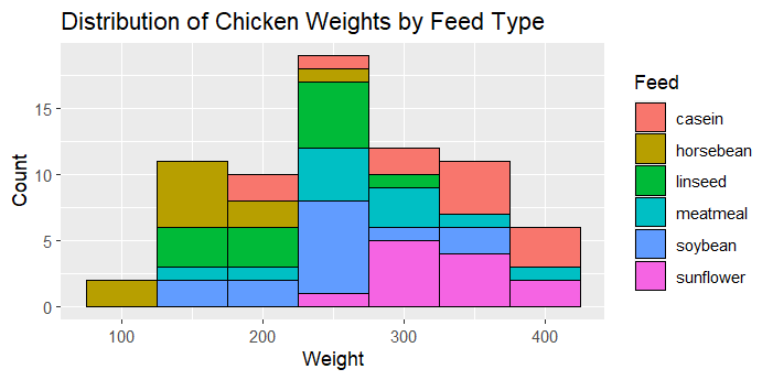 labs(title = "Distribution of Chicken Weights by Feed Type", x = "Weight", y = "Count") +
